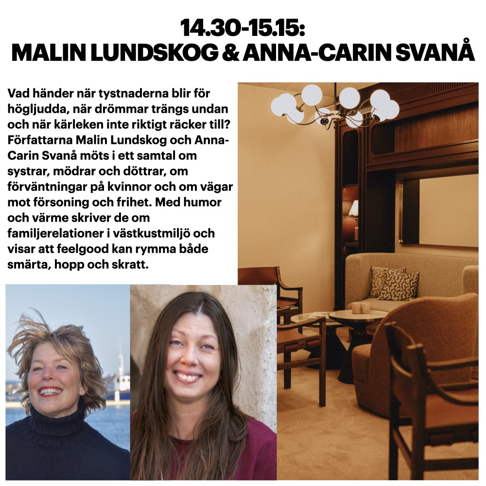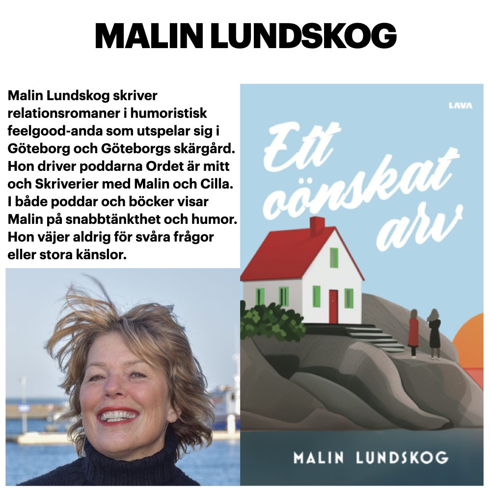 ”Malin Lundskog skriver relationsromaner i humoristisk feelgood-anda som utspelar sig i Göteborg och Göteborgs skärgård. Hon driver poddarna Ordet är mitt och Skriverier med Malin och Cilla. I både poddar och böcker visar Malin på snabbtänkthet och humor. Hon väjer aldrig för svåra frågor eller stora känslor.” Hur fint??? Som jag hoppas att jag lever upp till det här.